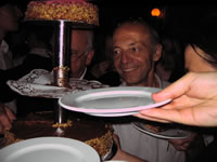 Verteilung der soeben überreichten Torte an die Musiker, nach dem Konzert des Großen Chors & Sinfonieorchesters am 29. 6. 2009 in Klärchens Ballhaus |